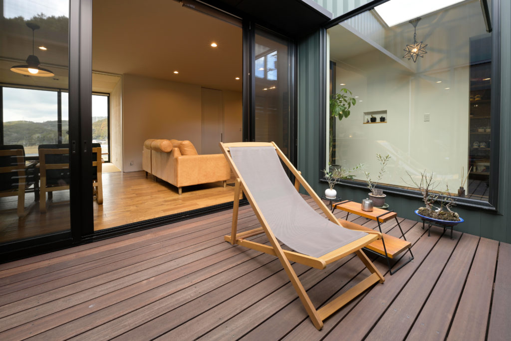 新築 大自然を感じながら、のんびり暮らせるガレージのある平屋 I様邸 ウォークインクローゼットウッドデッキ無垢材 モスグリーンの壁や斜め張りの杉板が調和する素敵な家が完成しました。 ウッドタイルの壁や、スクラッチ加工が施された無垢の床材の風合いを楽しめるリビングは、中庭から明るい光が差し込む開放的な空間。 パントリーを設けたキッチンからは、洗面脱衣室、ウォークインクローゼットなどまでぐるりと一周でき、家事動線も文句なし。 物件概要 延床面積38.16坪(126.15㎡) 前へ 施工事例一覧 次へ